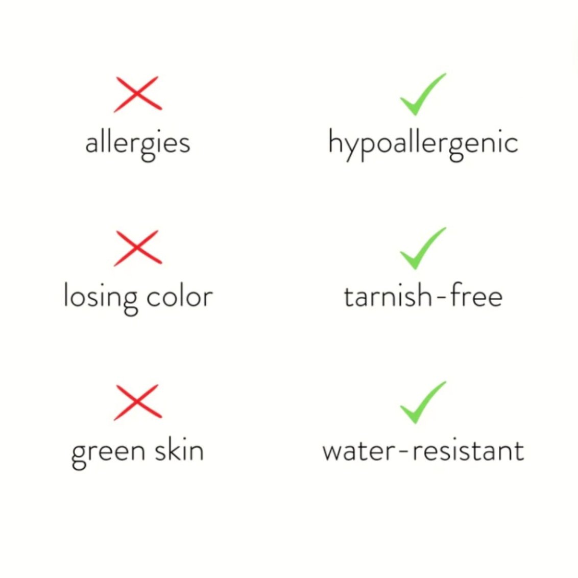 WATERPROOF, HYPOALLERGENIC, AND TARNISH RESISTANT.