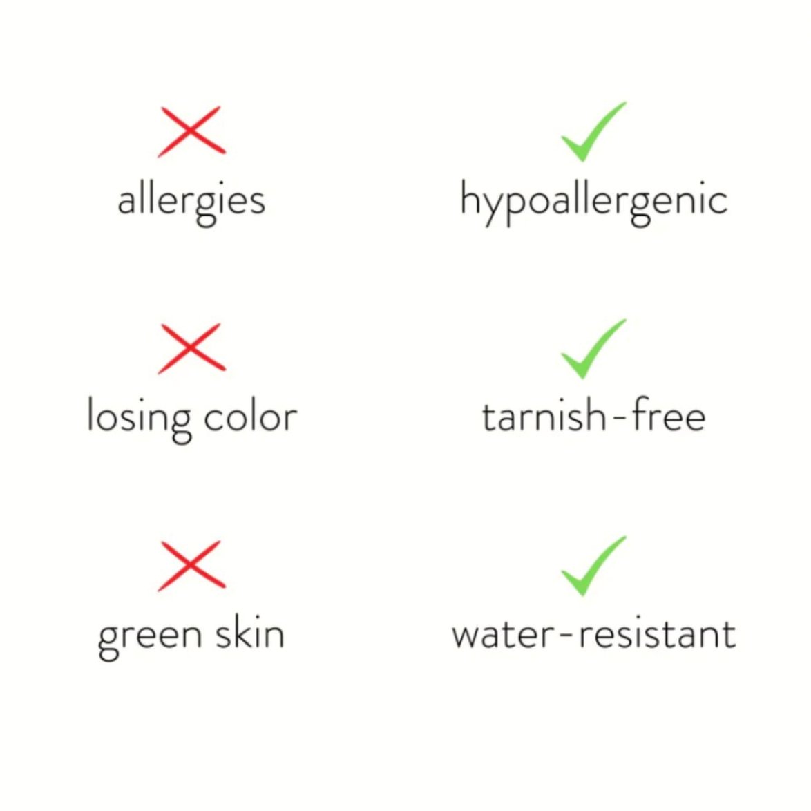 WATERPROOF, HYPOALLERGENIC, AND TARNISH RESISTANT.